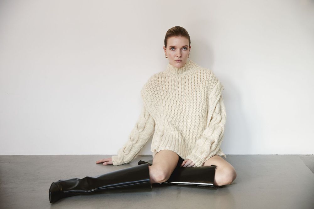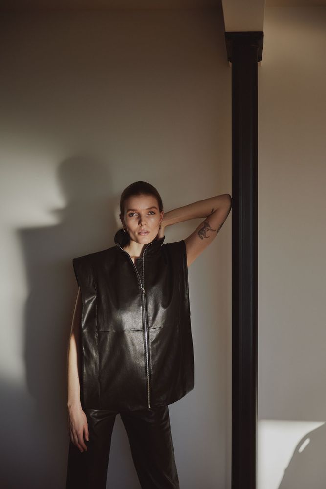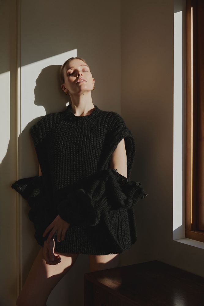 Showing in season, an array of biodegradable fabrics and earthy tones swept through Frysja. The timeless, gender-neutral collection created a versatile wardrobe of sweaters, suits, coats and statement leather pieces made to be worn multiple ways – a knit turned into a vest and a leather coat a dress.